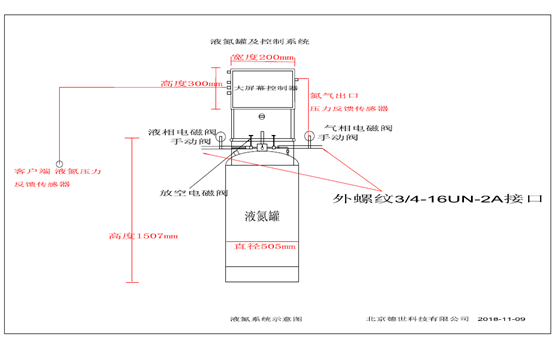 液氮罐補液控制系統由液氮補液罐、低溫智能化控制系統、閥門組件控制電磁閥和真空比例閥箱、PLC編程器、智能化控制人機交互控制終端、不間斷電源、溫度及壓力傳感器監控探頭系統及反饋電路系統組成,功能可根據客戶需求,定制相關罐體自動增壓-出液-排氣的壓力及流量控制程序。